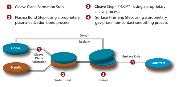 The NanoCleave® process uses an internal compressive strain layer to guide a fracture across the substrate to release the overlying film from the donor substrate. This processed donor wafer is then bonded onto the handle wafer to form a wafer assembly. To separate the donor layer from the rest of the donor wafer, the unique rT-CCP™ separation step cleaves the wafer assembly at the stressed region, thereby releasing the layer onto the handle substrate. By keeping all steps at low temperatures, the process has the added advantage of opening new applications such as dissimilar material layer-transfer.